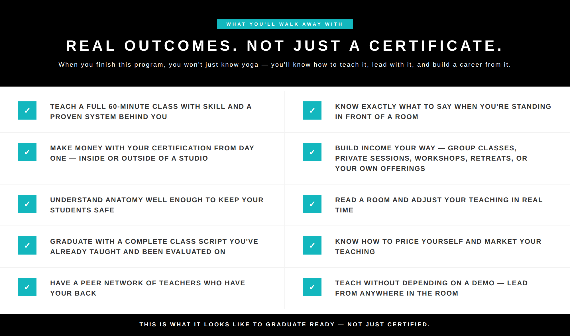 I created this online training because I keep seeing the same problem: smart, passionate people finish a YTT and still don't know how to teach. They have the certificate but not the skills, the confidence, or any idea how to make money with it. So I built something different — a program with a real method, live coaching, honest feedback, and a business curriculum that treats your certification like the career tool it should be.