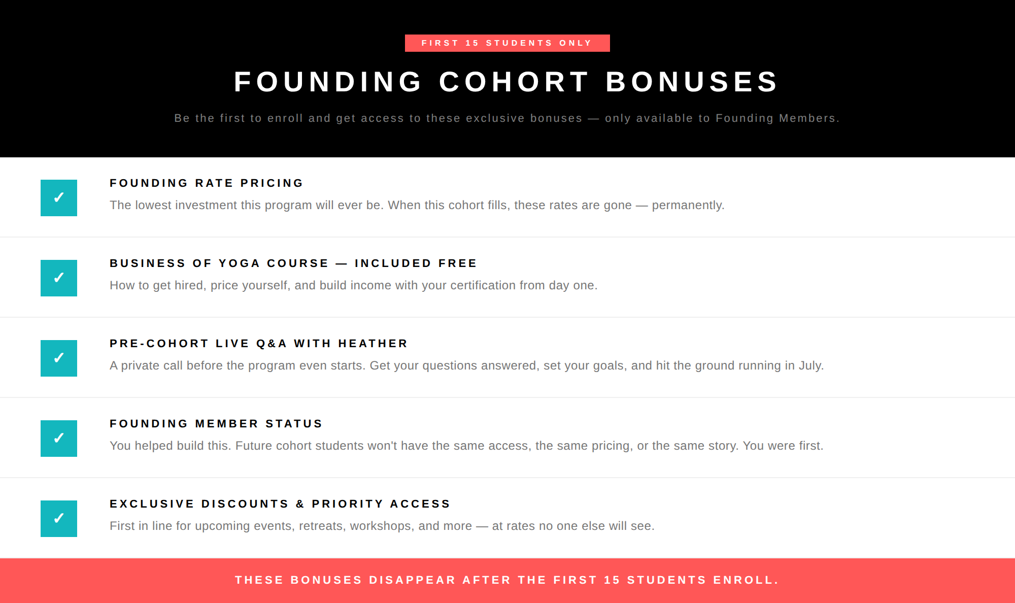 The founding cohort is the smallest, most supported, and most affordable this program will ever be. When these spots fill, the price goes up and these bonuses disappear.